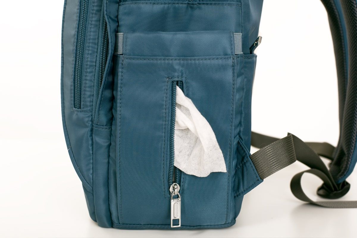 Kieszeń na mokre chusteczki – z boku torby jest kieszeń z szerokim otworem, z którego można wyciągać chusteczki. Kieszeń, do której możesz dosięgnąć nie ściągając plecaka z pleców. Dzięki temu możesz mieć je pod ręką w trakcie spaceru, bez konieczności szukania ich każdorazowo wewnątrz torby.