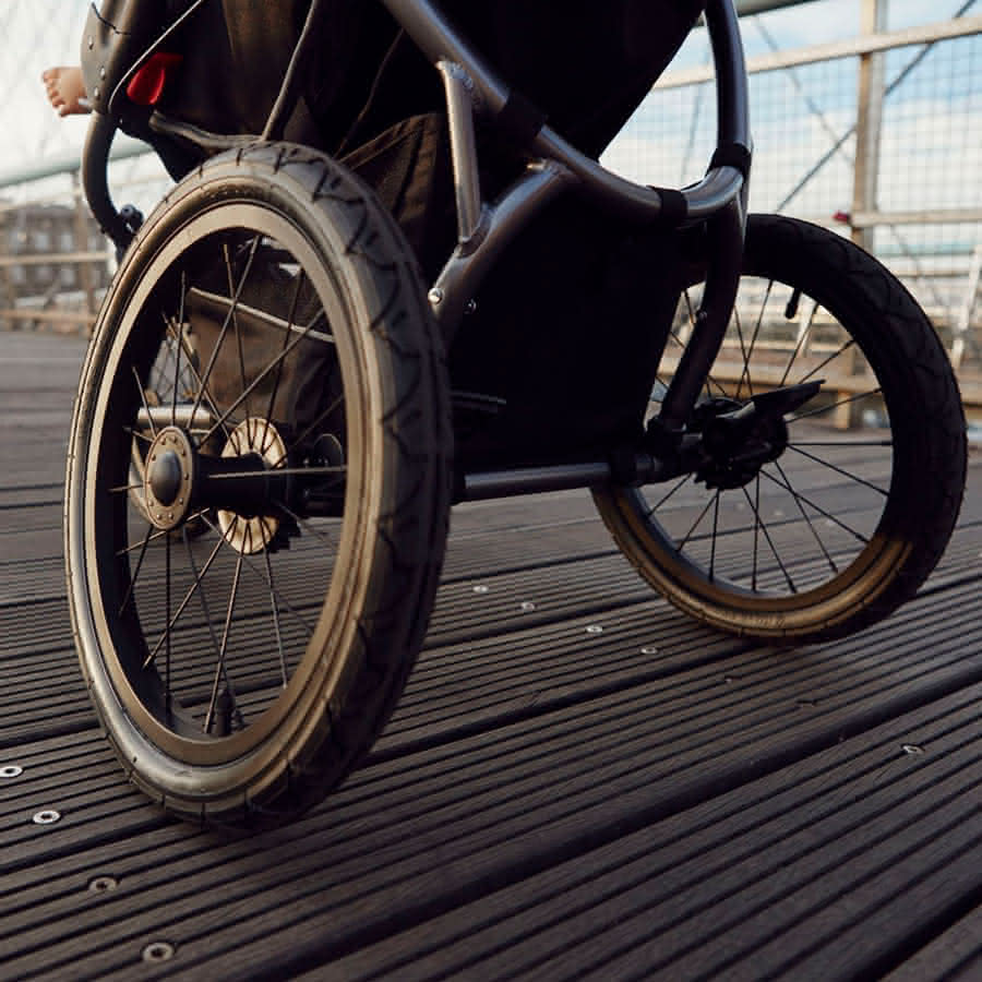 Kluczowe w trakcie treningu jest płynne toczenie wózka. Zapewniają to duże, pompowane koła. Ale nie tylko! Wpływ na łatwość toczenia mają wysokiej jakości łożyska, to one odpowiadają za łatwe kręcenie się kół na osiach. Wygodę dziecka gwarantuje obszerne siedzisko zawieszone hamakowo. To znaczy, że jest stabilnie zawieszone na konstrukcji ramy za pomocą pasków, tym samym ruch siedziska współgra z ruchem wózka, nie przenosząc drgań nawierzchni.
