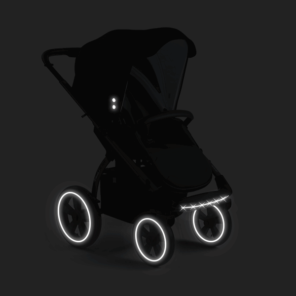 Jako pierwsi na rynku, w podnóżku wózka zastosowaliśmy diody LED z pulsującym światłem. Wieczorem lub przy źle oświetlonych drogach gwarantują one lepszą widoczność niż tradycyjne odblaski. Wszystko po to, żeby Twoje rodzinne szczęście było bezpieczniejsze
