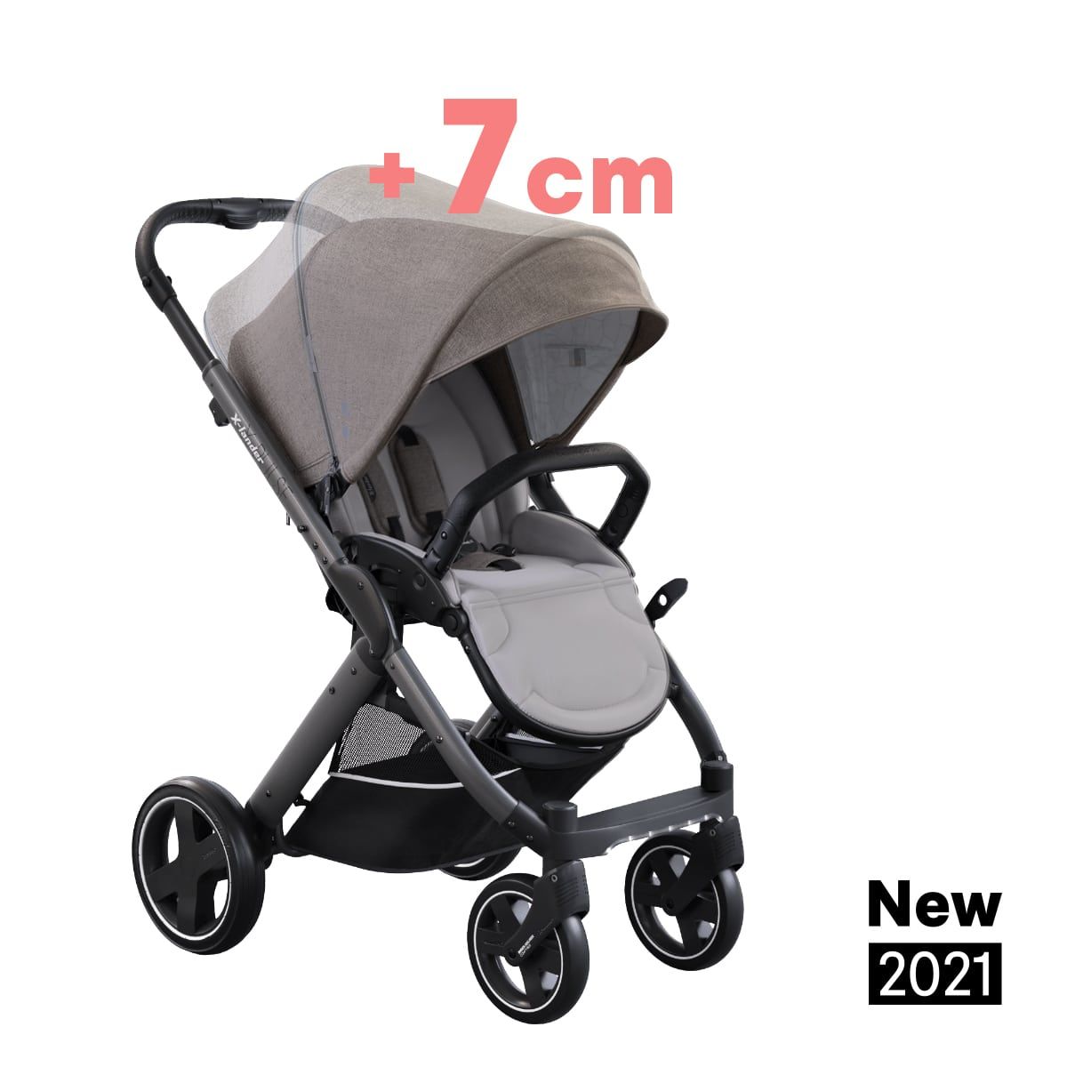 Dokonaliśmy znaczących zmian w amortyzacji przednich kół zwiększając zakres uginania, co sprawiło efekt jeszcze bardziej miękkiego zawieszenia. Miękka amortyzacja jest zauważalna przy nacisku z góry, a nie jak dotychczas, tylko przy uderzeniu w przeszkodę. Wózek X-Pulse posiada teraz niezawodną amortyzację na wszystkich 4 kołach. Dodatkowym atutem są pompowane tylne opony, które niwelują nierówności w trakcie jazdy. Dzięki temu, drgania powstające w trakcie jazdy, nie przenoszą się na dziecko, a są absorbowane przez zawieszenie wózka. Nowa wersja wersja wózka 2021 posiada lepszą, wyższą budkę. Nowe wymiary budki znacząco powiększyły przestrzeń wewnątrz wózka. Teraz nawet wysokie, czy starsze dziecko ma dużo miejsca nad głową. To rozwiązanie sprawia, że wózek sprawdzi się od urodzenia, aż do końca okresu wózkowego, bez konieczności kupowania większej spacerówki.