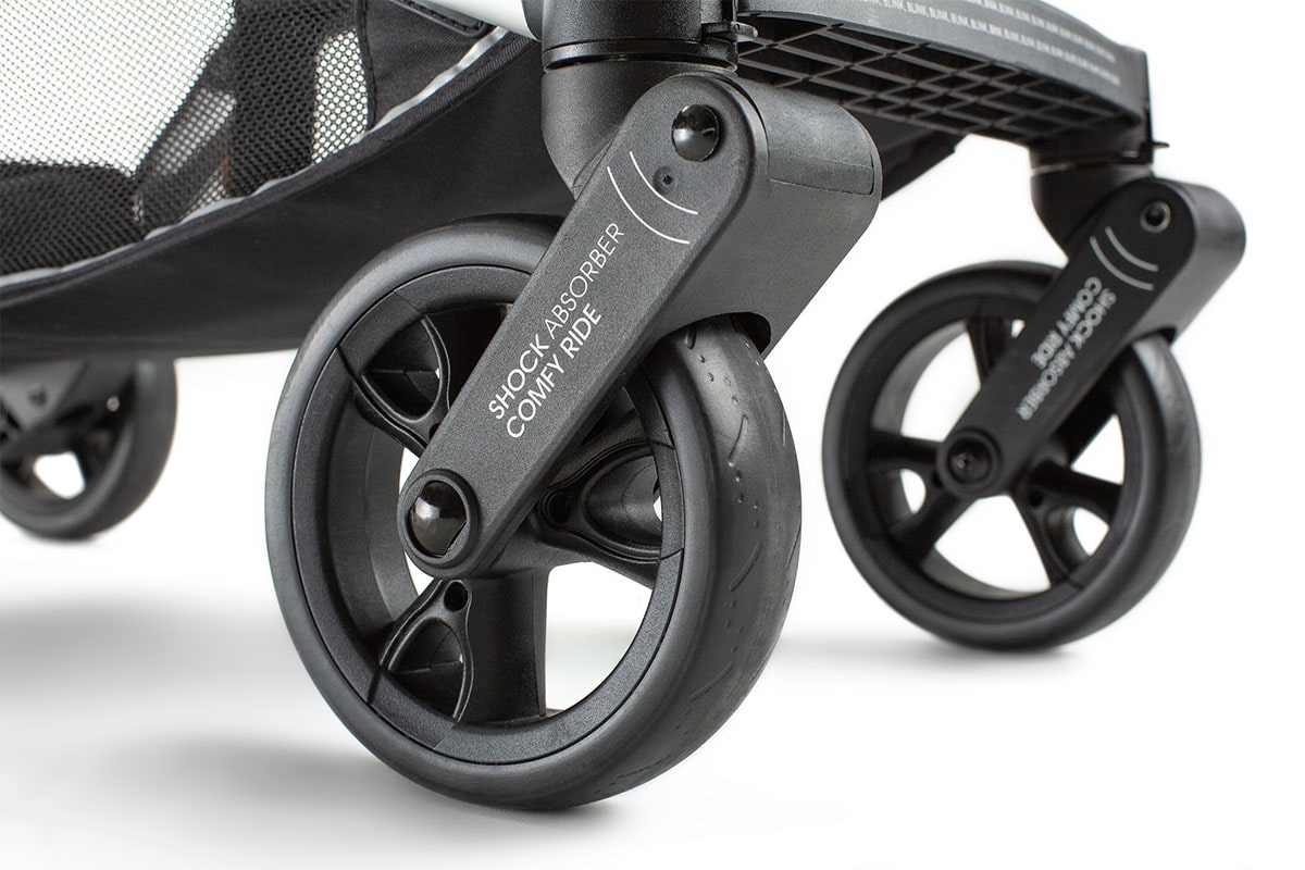 Dzięki temu, że wózek spacerowy posiada amortyzację wszystkich kół, zarówno przednia, jak i tylna oś wózka niweluje nierówności powierzchni. Nawet najmniejszą z nich amortyzują sprężyny znajdujące się w mocowaniu koła. A to z kolei sprawia, że drgania nie zostaną przeniesione na Twoje dziecko, zamieniając spacer w bezpieczną oraz spokojną przejażdżkę.