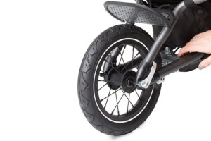 To wyjątkowo przyjazny rodzicom patent na ściąganie kół. Wiemy jak cenna potrafi być każda sekunda, kiedy podczas treningu ma się przy sobie małe dziecko. Dlatego wystarczy jeden ruch dłoni, a dźwignia trzymająca koła zwalnia się i pozwala na ich szybki demontaż. Dzięki temu wielkość ramy również znacząco się zmniejsza, ułatwiając transport wózka. Także tylne koła odpinają się łatwo.