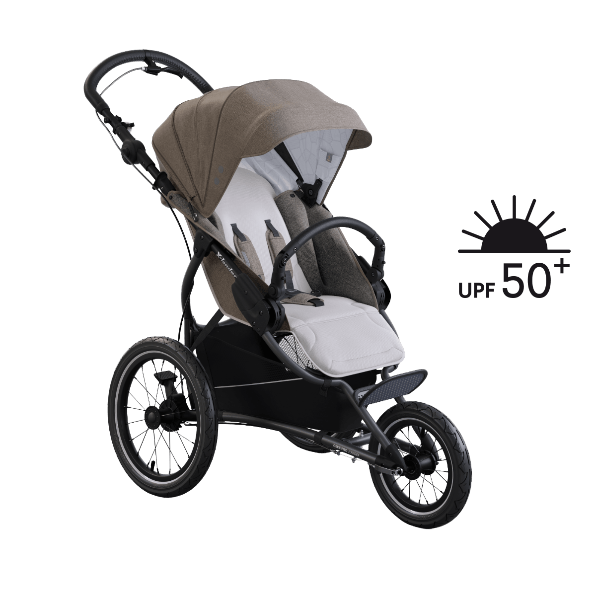 Żadna energiczna jazda nie zagrozi wygodzie i ochronie malucha. Siedzisko zawieszone jest na linkach, co minimalizuje drgania i nie z pozwala ich przenieść do środka wózka. Dzięki temu wózek do biegania z dzieckiem sprawdzi się nawet na nierównych, szutrowych drogach.
