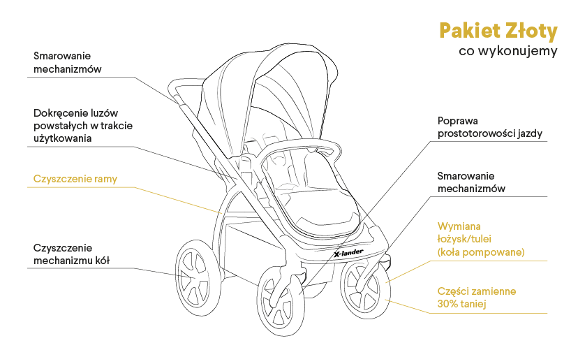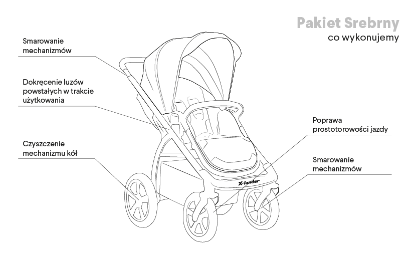 Jak każdy sprzęt podlegający eksploatacji, wymaga serwisowania. Użytkując go dłuższy czas, lub szykując sprzęt dla nowego członka rodziny, warto zadbać o jego bezpieczeństwo i komfort jazdy. Będąc producentem marki X-lander chcemy zaoferować profesjonalny przegląd wózków. Jakość usługi gwarantują oryginalne części zamienne oraz specjaliści serwisu X-lander.